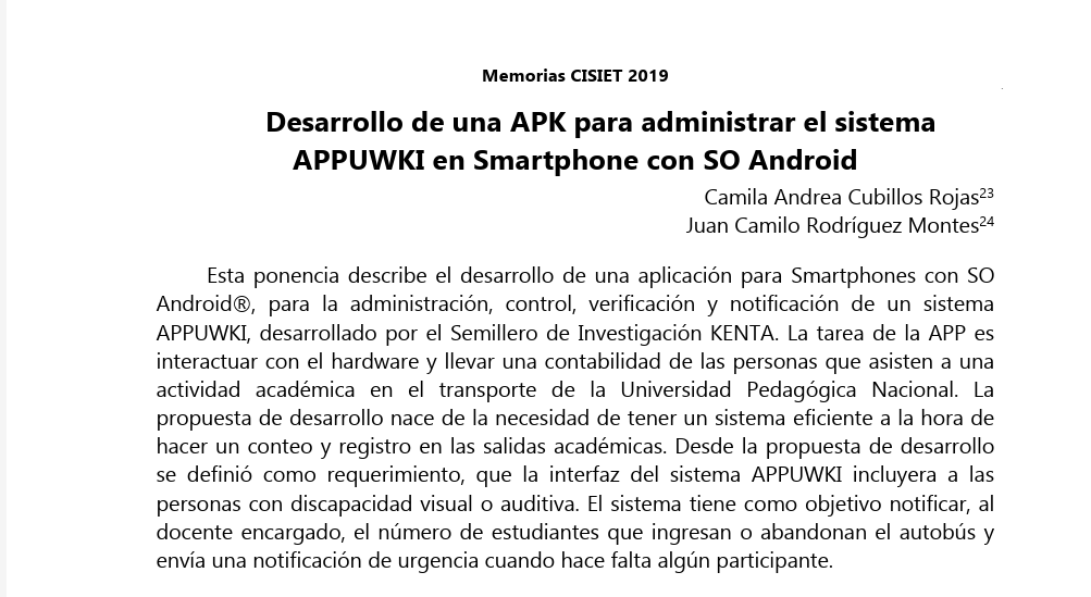 Desarrollo de aplicación Android para administrar el sistema APPUWKI en smartphones. Proyecto presentado en el Congreso Internacional de Semilleros de Investigación CISIET 2019 en Ecuador.