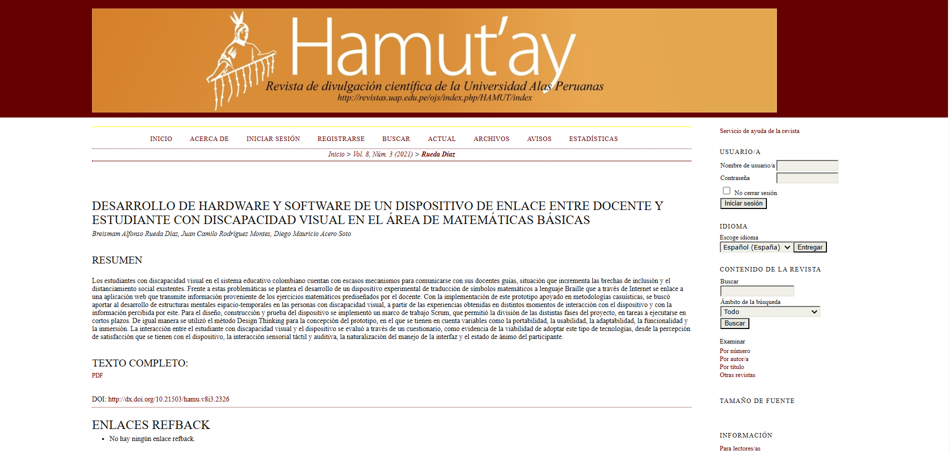 Desarrollo de hardware y software de un dispositivo de enlace entre docente y estudiante con discapacidad visual en matemáticas básicas. Presentado en congreso internacional en Chile.